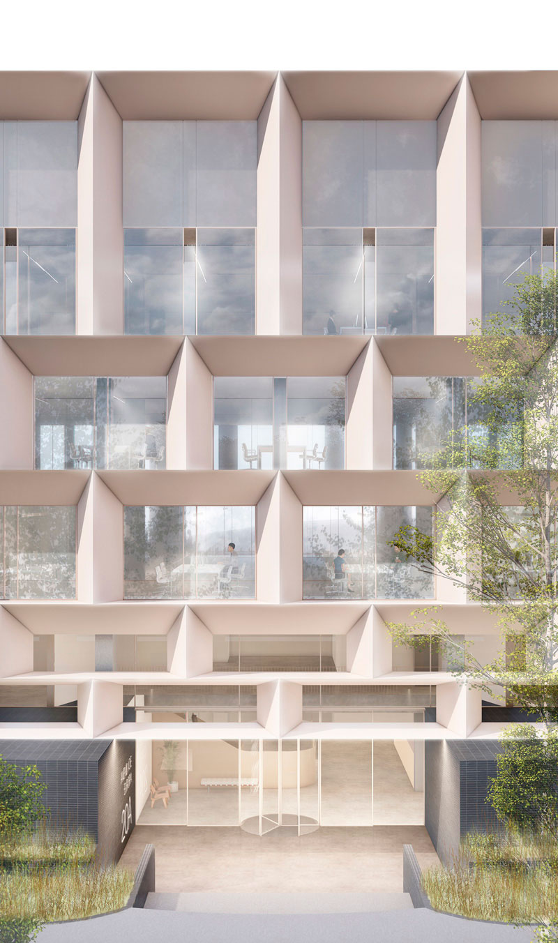 In order to achieve a greater presence and visibility of the building, the building envelope is reformed. The roof facilities floor is integrated into the complex and the façade is enlarged, which distorts the scale of the building, increasing its urban presence and visibility from the highway. A new deep façade is projected which, in addition to transforming the building’s image, improves the building’s energy performance by protecting the building from direct sunlight and optimizing solar gains.