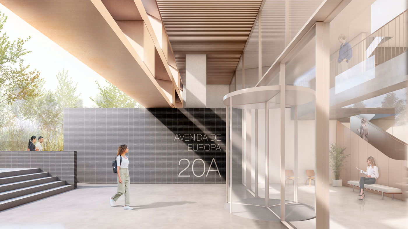 The building object of the project is located recessed from the plot plan with respect to the Avenida de Europa in Madrid. Special attention is given to the design of this space prior to the building, which serves as a pedestrian access and relationship area prior to the entrance of the building. The road access to the building is modified and is now done through the southern edge of the plot, directly accessing the ramp down to the basement floors. The building has two basement parking levels.