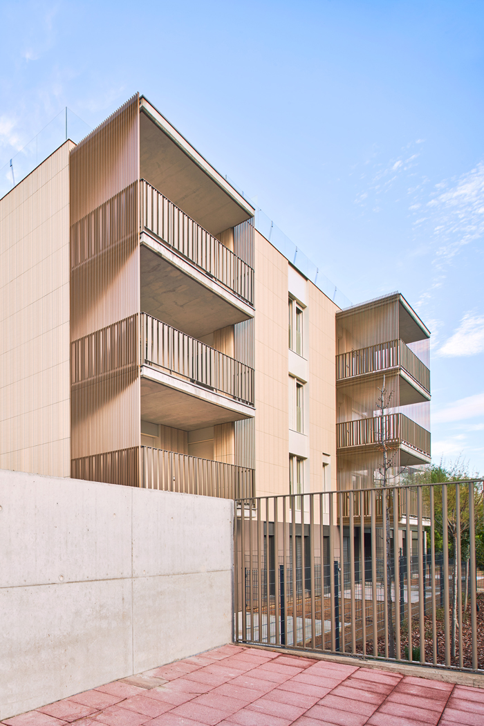 The concept is a series of interrupted compact buildings to fit in with the scale of the site and avoid large facades (maximum length is 34m). Also, this configuration favours a natural and simple topographic integration with the site and groups of three apartments sharing common landings.