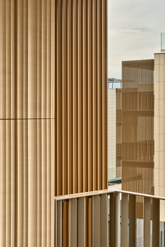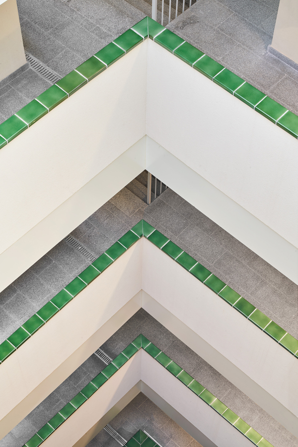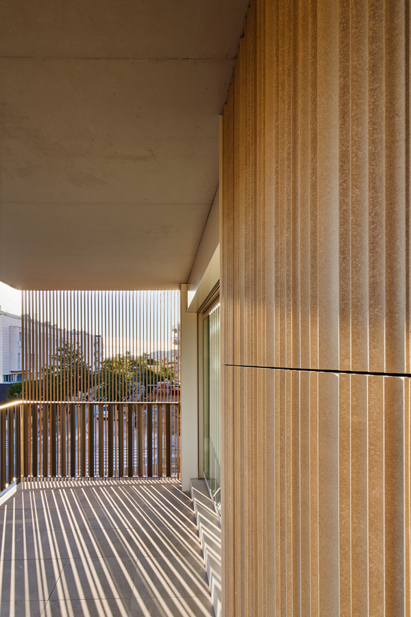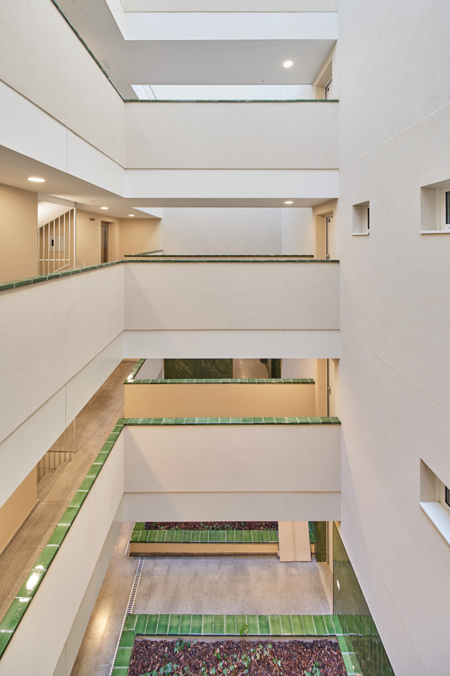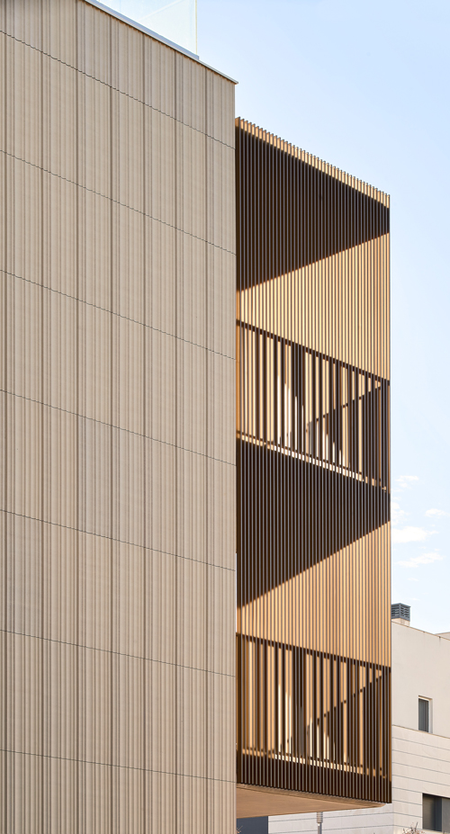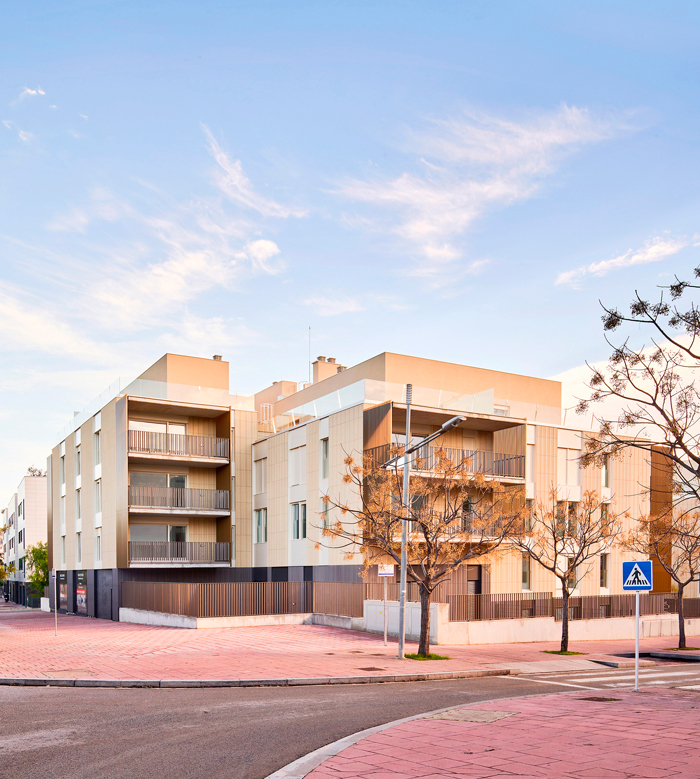 Access to the entrance piazza and the internal walkway that links both lobbies is from Joan Puig Mestre Street. There is a common landscaped area, a series of shaded spaces, an access piazza, a play area and an outdoor swimming pool for adults between the two buildings. Given the area of movement and the site orientation, the project aims to arrange various directions by placing the apartments in the corner.