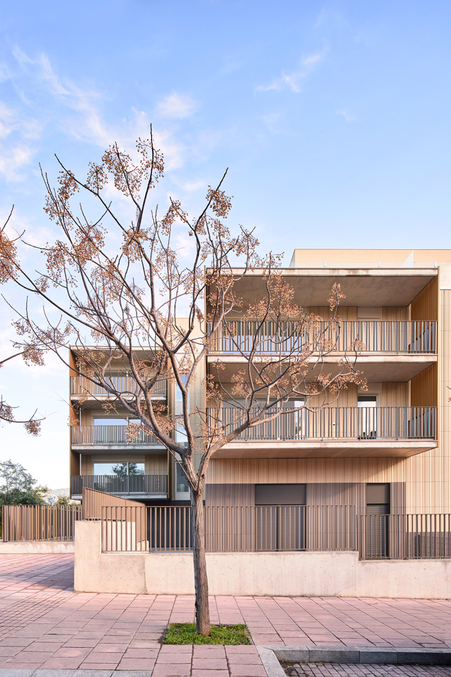 Two compact buildings on a site with a slight gradient towards the south. The first building is located on the north section of the site (Block A) and the second on the south section (Block B). Block A, with mixed-use units on the ground floor, is aligned with Camà de Capellans, consolidating the corner of the site.