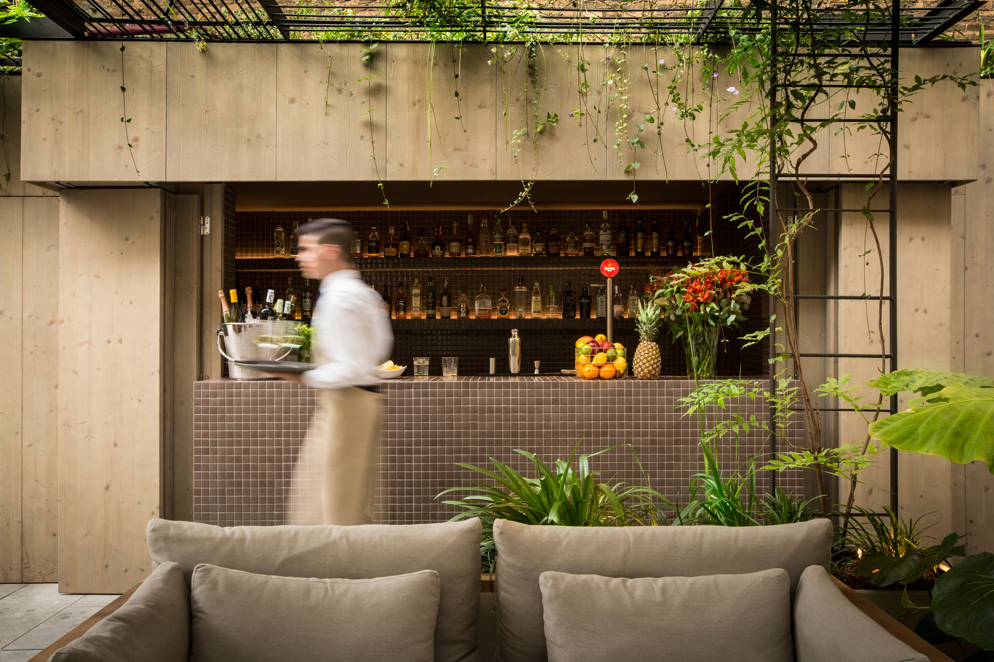 The existing area did not have any solid structural elements to undertake an intervention of this nature. By taking advantage of the integral refurbishment of the lower floor it was possible to carry out a structural reinforcement of the slabs. Many of the decisions made for the project are based on this. In the green space at the back, large stainless steel planters on iron beams have been accommodated. To merge the landscape, a galvanised torsion wire mesh has been placed over this layer, so plants can creep up to cover all the area. The intermediate green roof has been landscaped as a green roof.