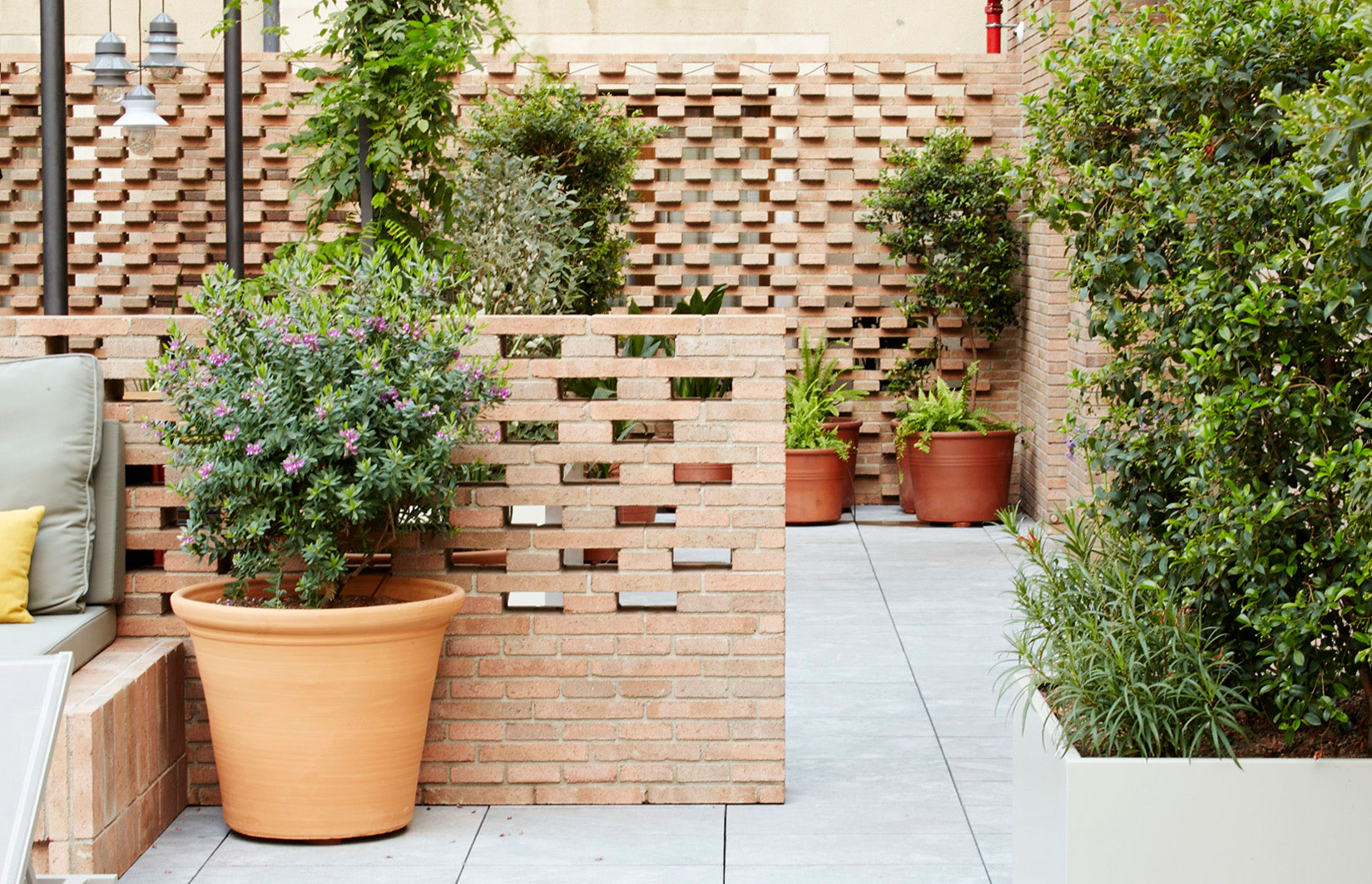 The latticework is completed with two lower brickwork benches, one for the bar and another one for the sundeck. Four different types of bonding have been used. The swimming pool wall has been built using stretcher bond, embossing the brickwork in an alternate manner; open stretcher and header bond have been used in the two intermediate walls, while traditional stretcher bond has been applied to the new section of the internal room.