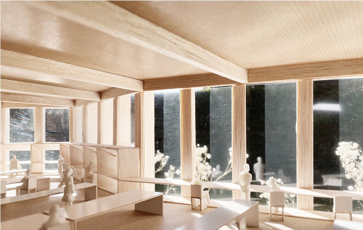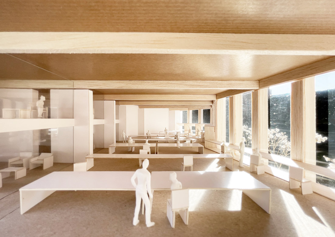 In the room at the back, a space of generous height oriented to the north and to the views, a linear and continuous table is developed that allows different types of study and concentration with different levels of intimacy and concentration. This orientation allows optimal behavior in terms of light intensity necessary for the library throughout the year, avoiding direct sunlight.