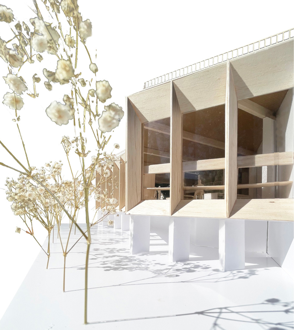 To configure these platforms, a retaining wall is built with buttresses and sufficient thickness to contain and evacuate the water, achieving the necessary sealing. The space is built between the powerful buttresses, the light that falls from the south at the access point and the porticoes perpendicular to the façade separated from the ground and facing north.