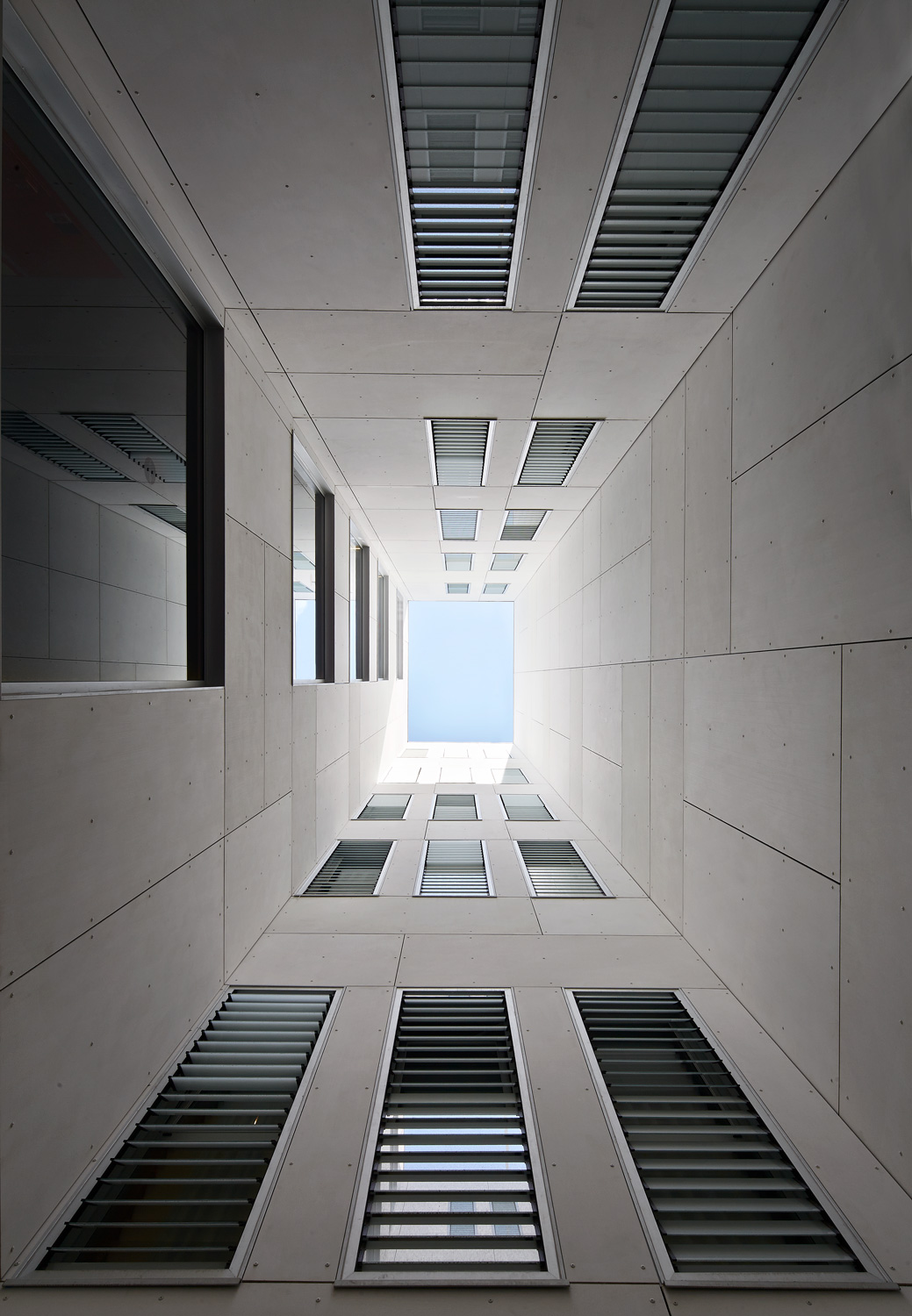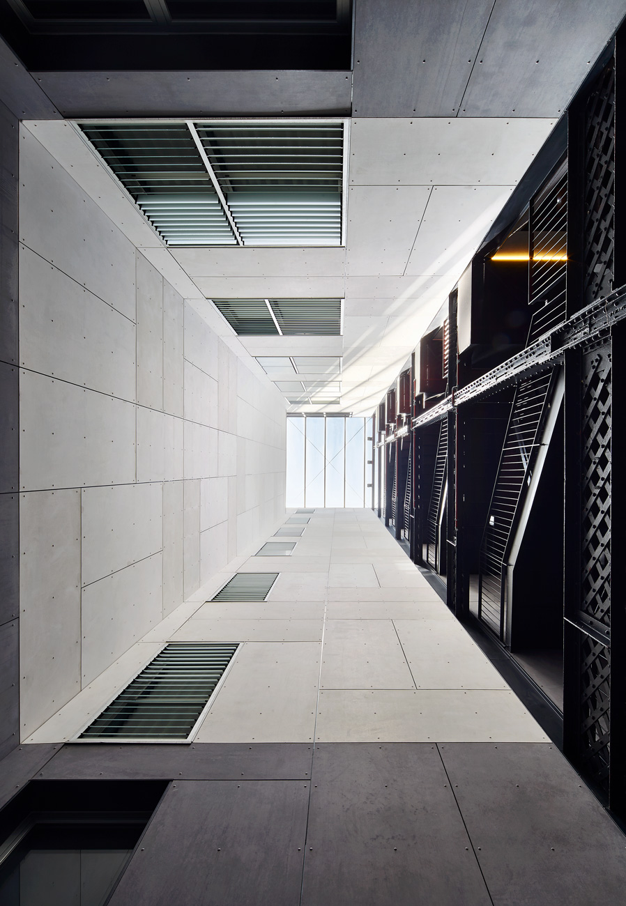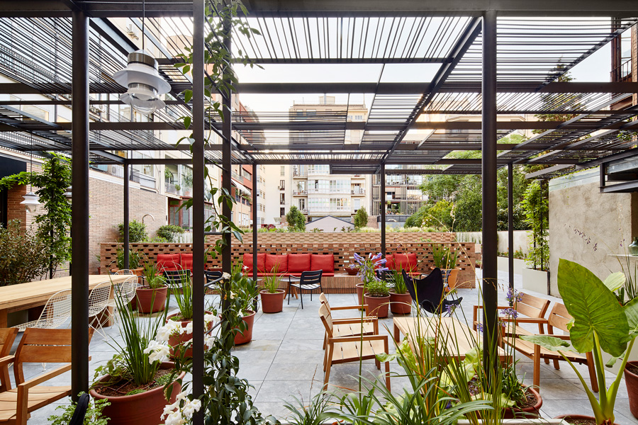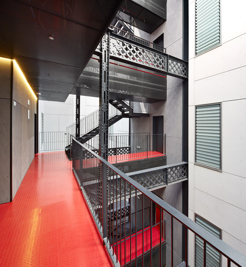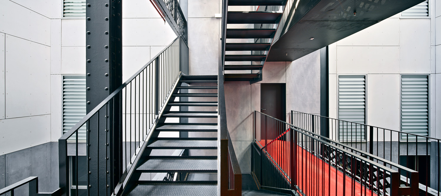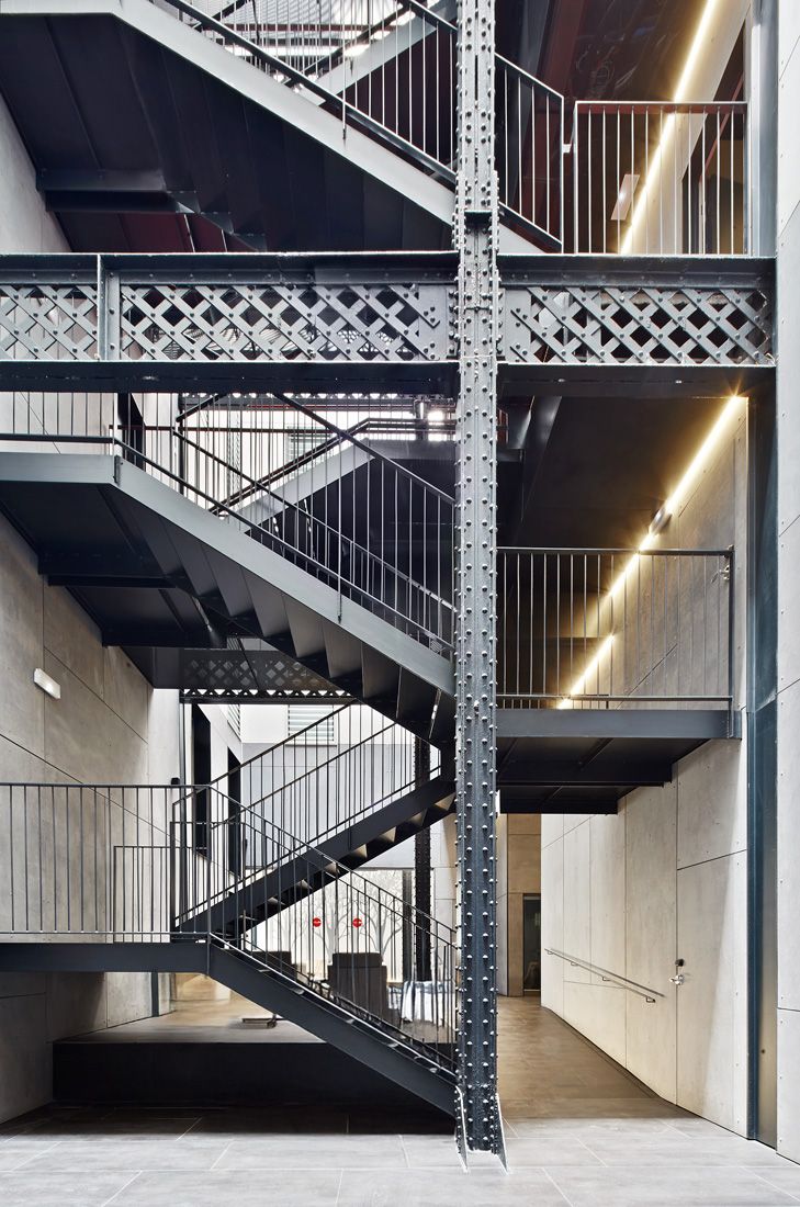 At the heart of the proposal lies a new roofed “L”-shaped atrium, which organizes circulation and filters natural light through all levels. Two staircases and two lifts are integrated into this space, linked by light metal bridges. The intervention recovers and exposes the original riveted steel beams and columns, celebrating the industrial character while integrating new structural elements within the courtyard.