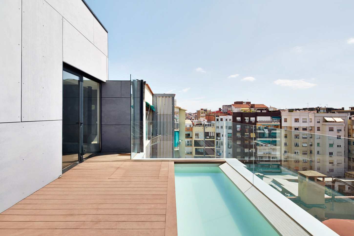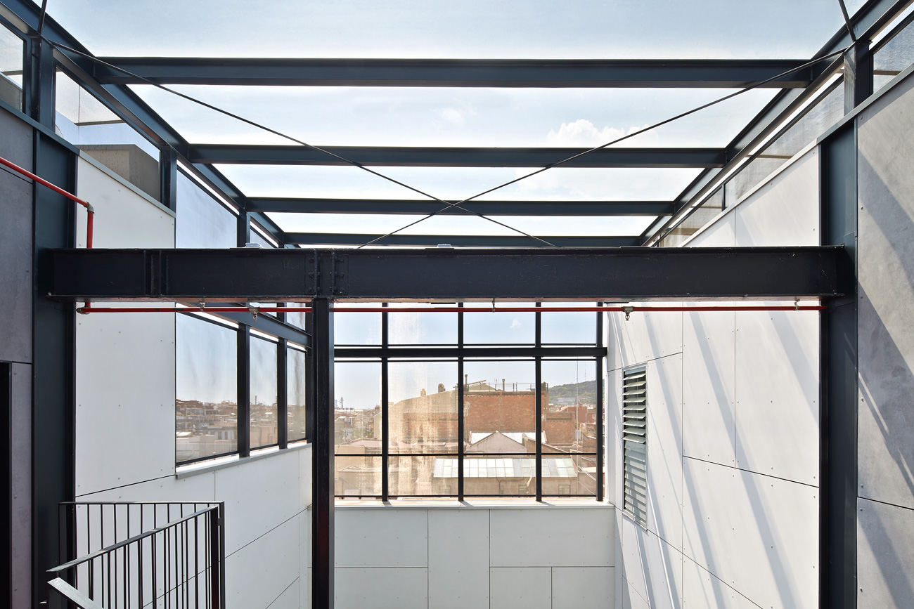 The building, sited in the corner between Aragó street and Viladomat street, is part of the Special Complex of Cerdà’s Growth Plan of Barcelona, and was built in 1950. A large extension was carried out in 1965, which resulted in the current building, comprising ground floor, mezzanine and five upper floors crowned with an attic.