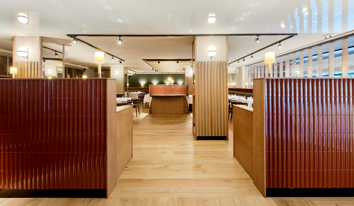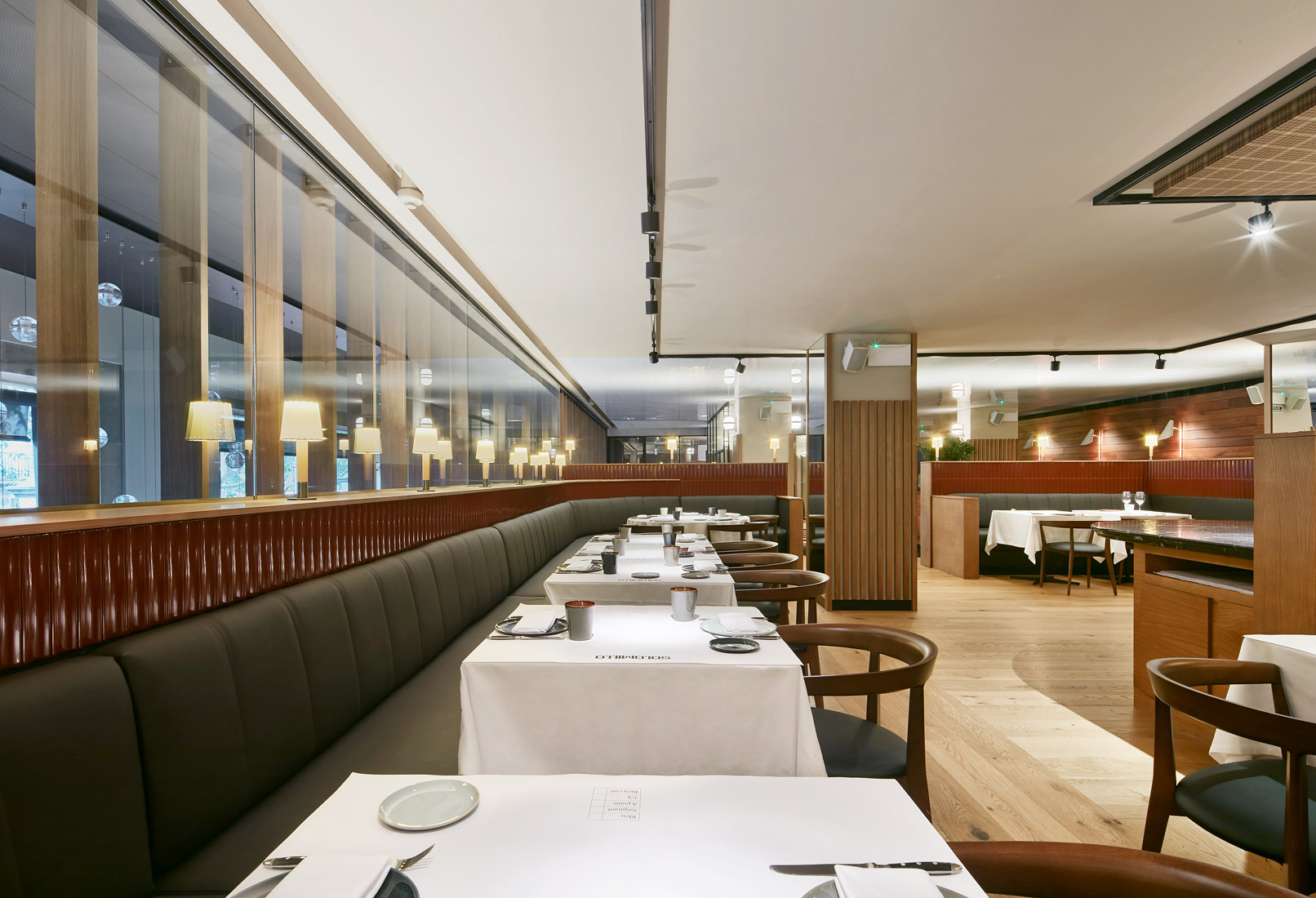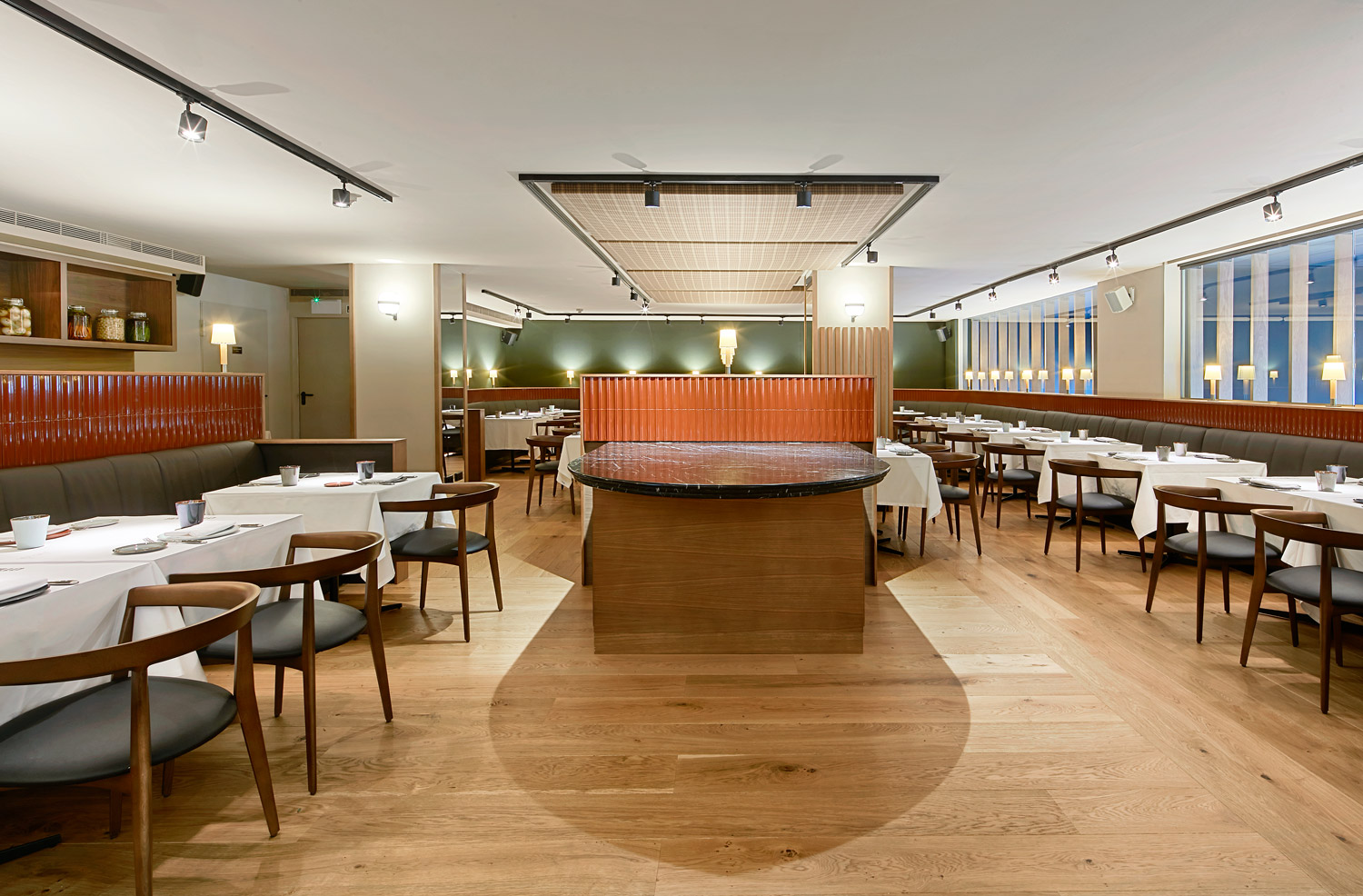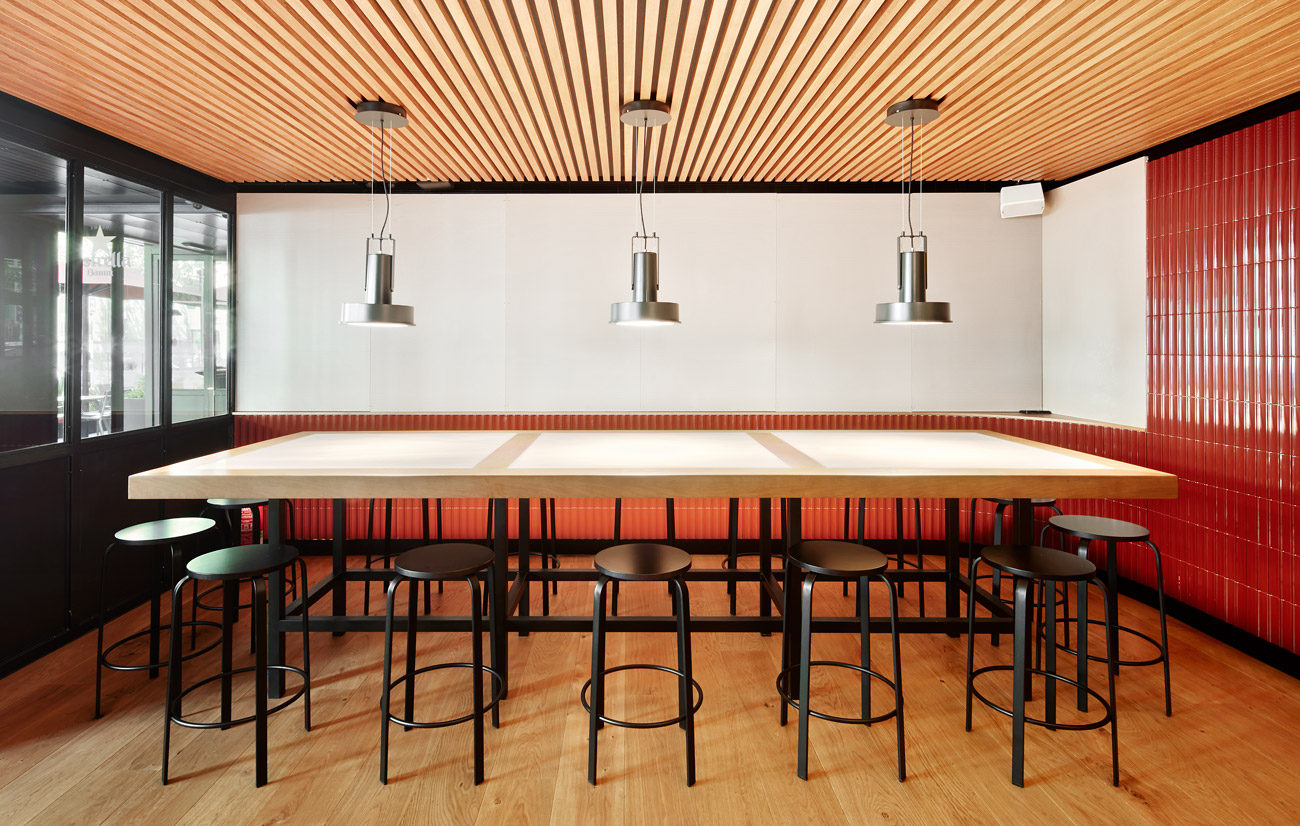 The restaurant plan is based on a 15mx9m rectangular open grid. Tables are spread similar to a French bistro, adjacent to each other along the perimeter, so that they can be gathered or separated depending on the number of diners. The mezzanine is delineated following the same pattern as the ground floor, but with slightly smaller partitions made of ceramic tiles. These partitions form benches, areas and corners of different dimensions, as well as more intimate areas to place the tables. In the middle of this space, an island of tables and a support area for the staff breaks up the room, achieving more discrete and quieter spaces.